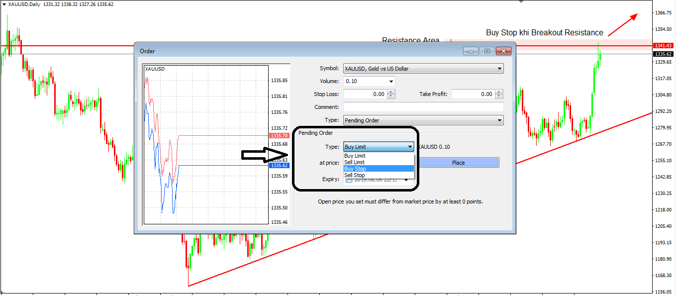 Cũng như 4 lệnh trong nhóm Pending Order, cài đặt lệnh Buy Stop cũng hết sức đơn giản.