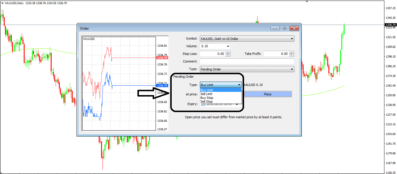 Chọn Pending Order để cài đặt sử dụng các lệnh chờ.