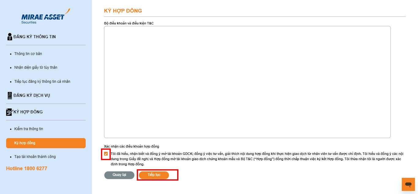 Như vậy bạn đã hoàn thành ký hợp đồng số. Bạn sẽ được tặng cho mỗi khách hàng 50k trong tài khoản chứng khoán Mirae Asset của mình.