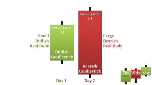 Nguyên nhân: Nhìn chung, khối lượng giao dịch lớn ở cây nến giảm mạnh (nến thứ 2) cho biết có một sự biến động mạnh diễn ra trong ngày và người bán liên tục bán ra ở giá thị trường, do đó giá giảm liên tục và đây là dấu hiệu giảm giá rất rõ. Để làm rõ vấn đề này với khái niệm cung cầu, nếu có nhiều trader sẵn sàng bán (cung nhiều hơn) và có ít trader sẵn sàng mua (cầu ít hơn) thì giá sẽ giảm, kết quả là nến giảm được tạo ra, khi mà giá mở cửa và giảm suốt cả ngày rồi đóng cửa thấp hơn vùng mở cửa. - Thân nến thứ hai lớn hơn cả cây nến trước đó (bao gồm bóng nến).