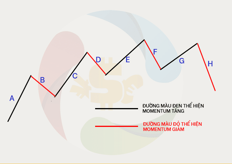 - So sánh đà tăng của giá hiện tại với đà tăng của sóng cùng chiều trước đó:Bây giờ chúng tôi sẽ loại bỏ các sóng giảm và chỉ nghiên cứu sóng tăng để xem giá đang đi nhanh hay chậm hơn trước.So sánh 4 sóng (a), (c) (e) và (g) cho thấy momentum đang giảm đi. Phe mua đang trở nên yếu thế hơn.Đà giảm đang xuất hiện Bây giờ chúng ta loại bỏ các sóng tăng và chỉ giữ lại sóng giảm.So sánh độ dốc của đường lên (B) (D) (F) và (H) cho thấy đà giảm đang tăng lên. Bên bán đã trở nên mạnh hơn. Biến động giá có nhiều khả năng đi theo hướng mạnh và chống lại hướng yếu nghĩa là đi xuống và chống lại xu hướng tăng hiện t