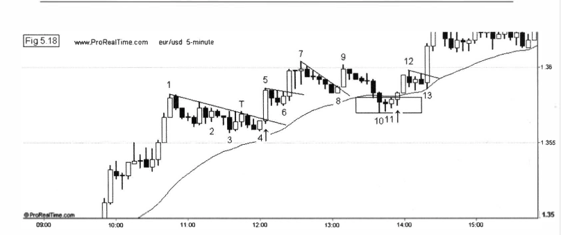 giá phá vỡ vùng 46 và breakout trader vào lệnh tại 1. Giá tạo đỉnh cao hơn tại 8 nhưng không thể giữ được mà đảo chiều. Rơi xuống điểm 9 thì các pullback trader nhảy vào kỳ vọng giá tăng lên, nhưng chỉ tăng lên được tới 10 rồi giảm xuống. Đây là dấu hiệu suy yếu đầu tiên của xu hướng.