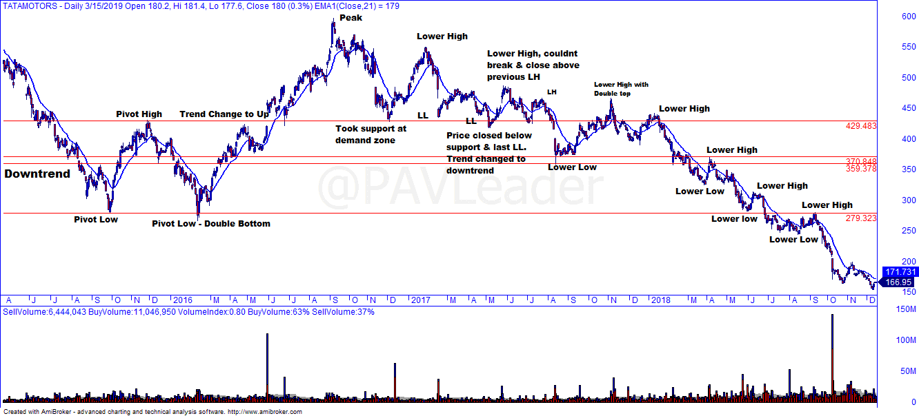 Xu hướng giảm được xác định khi giá tạo thành 1 đỉnh thấp hơn đỉnh trước VÀ 1 đáy thấp hơn đáy trước.