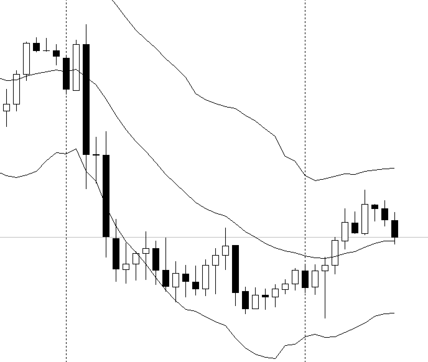 Nến 1: nến giảm lớn đóng cửa ở mức thấp với volume cực lớn (gấp đôi so với các thanh volume trước đó), cho thấy đây là 1 cú xả hàng kết hợp với bán tháo. Tuy nhiên thanh nến này vẫn để lại 1 chút bóng dưới, cho thấy vẫn còn 1 vài con bò nhảy vào cố gắng bắt đáy. Việc giá giảm nặng nề và giao dịch nhất quán dưới đường MA cho thấy xu hướng giảm khả năng vẫn còn tiếp diễn.