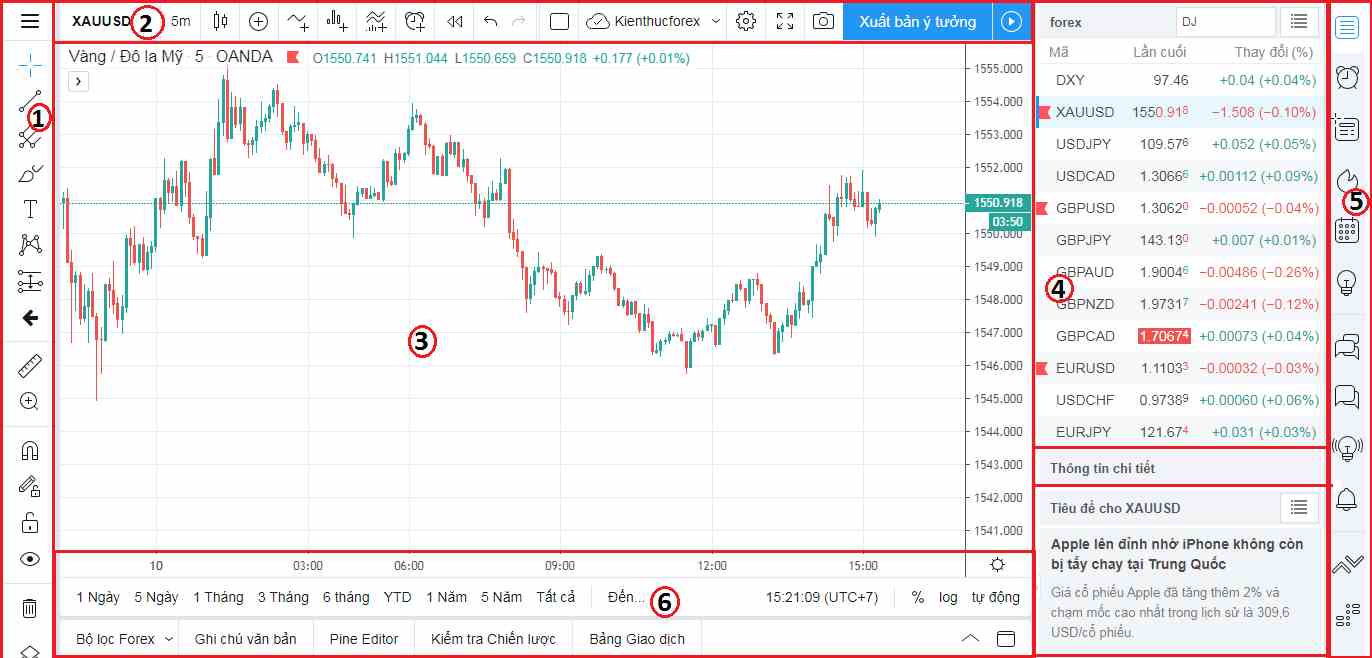 Ngoài ra, còn 1 phần nhỏ bên trong cùng dùng để kết nối với các trader khác (được ký hiệu bằng ô số 5 như hình trên). Đây là nơi giúp cho TradingView trở thành mạng xã hội dành riêng cho trader, chủ yếu tích hợp các công cụ trò chuyện, lịch kinh tế, hay chứa các group nhỏ nơi trader có thể tham gia bàn tán cùng các trader khác.